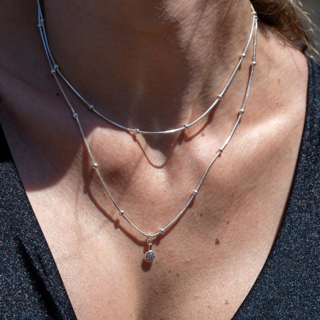 Colar duplo com pingente cravejado. Design autoral, feito à mão.
